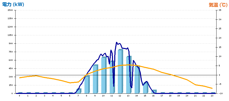 | 時刻 | 日射強度 (kW/㎡) | 気温 (℃) | 発電電力量 (kWh) | CO2削減量 (kg-CO2) | 売電金額(概算) (円) |