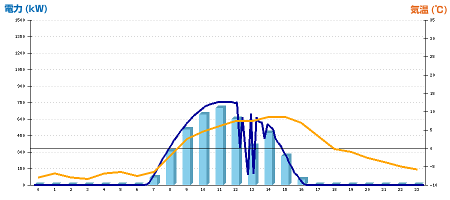 | 時刻 | 日射強度 (kW/㎡) | 気温 (℃) | 発電電力量 (kWh) | CO2削減量 (kg-CO2) | 売電金額(概算) (円) |