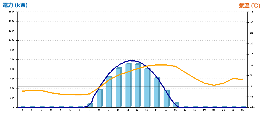 | 時刻 | 日射強度 (kW/㎡) | 気温 (℃) | 発電電力量 (kWh) | CO2削減量 (kg-CO2) | 売電金額(概算) (円) |