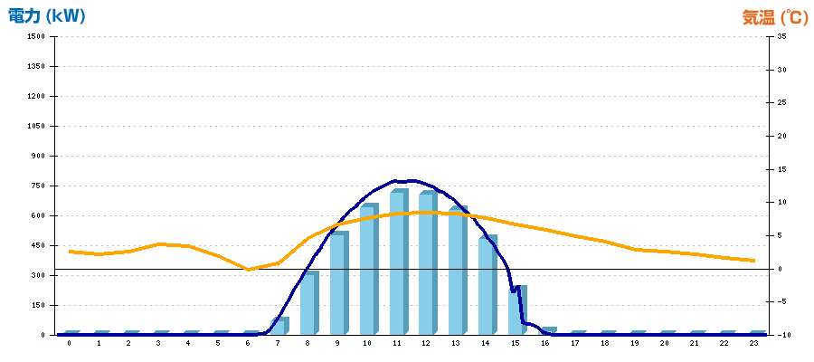 | 時刻 | 日射強度 (kW/㎡) | 気温 (℃) | 発電電力量 (kWh) | CO2削減量 (kg-CO2) | 売電金額(概算) (円) |