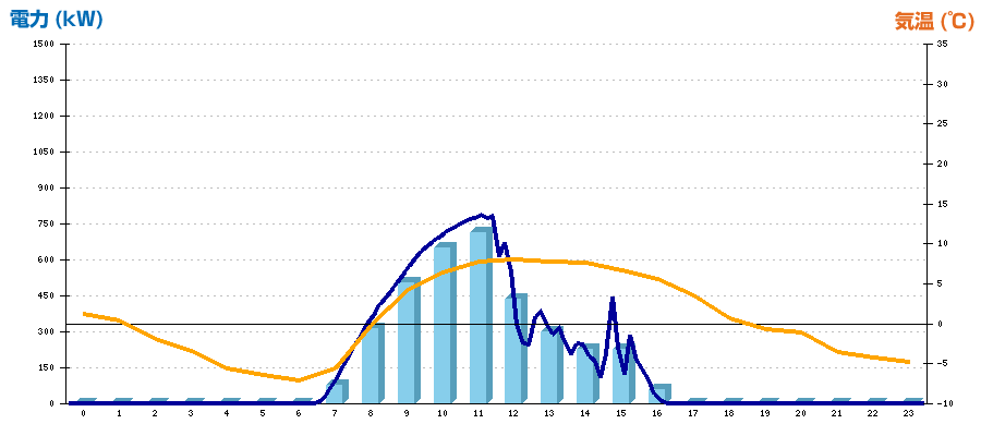 | 時刻 | 日射強度 (kW/㎡) | 気温 (℃) | 発電電力量 (kWh) | CO2削減量 (kg-CO2) | 売電金額(概算) (円) |