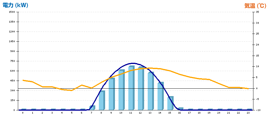 | 時刻 | 日射強度 (kW/㎡) | 気温 (℃) | 発電電力量 (kWh) | CO2削減量 (kg-CO2) | 売電金額(概算) (円) |