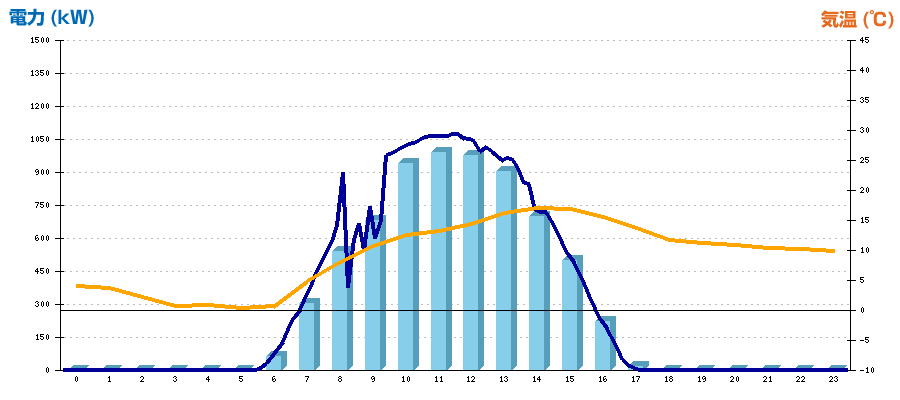 | 時刻 | 日射強度 (kW/㎡) | 気温 (℃) | 発電電力量 (kWh) | CO2削減量 (kg-CO2) | 売電金額(概算) (円) |