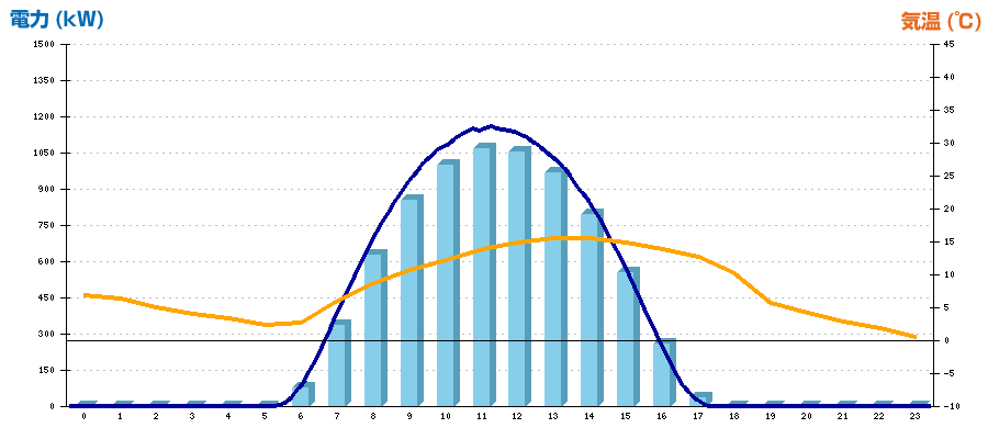 | 時刻 | 日射強度 (kW/㎡) | 気温 (℃) | 発電電力量 (kWh) | CO2削減量 (kg-CO2) | 売電金額(概算) (円) |