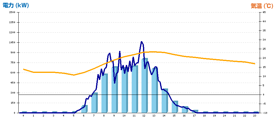 | 時刻 | 日射強度 (kW/㎡) | 気温 (℃) | 発電電力量 (kWh) | CO2削減量 (kg-CO2) | 売電金額(概算) (円) |