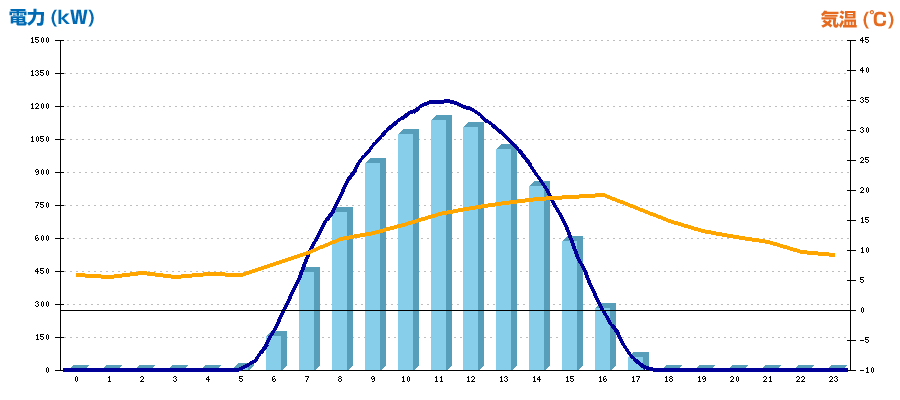 | 時刻 | 日射強度 (kW/㎡) | 気温 (℃) | 発電電力量 (kWh) | CO2削減量 (kg-CO2) | 売電金額(概算) (円) |