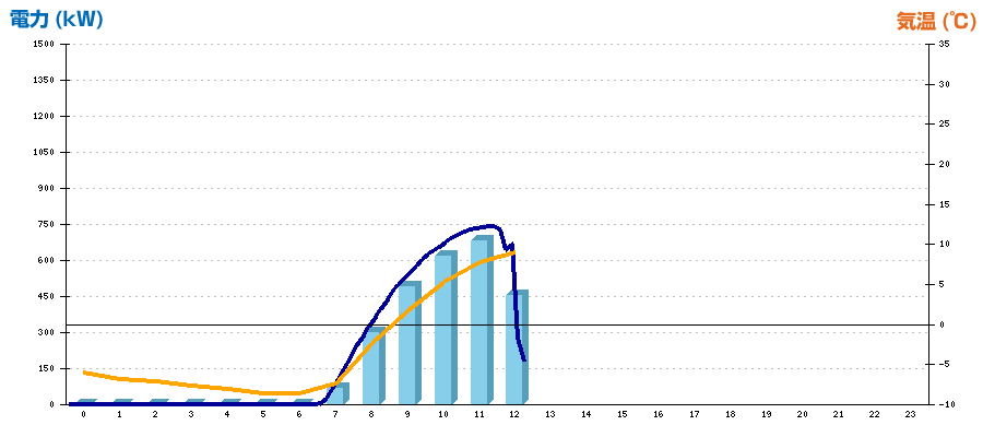 | 時刻 | 日射強度 (kW/㎡) | 気温 (℃) | 発電電力量 (kWh) | CO2削減量 (kg-CO2) | 売電金額(概算) (円) |